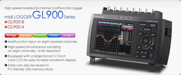 GRAPHTEC Instrument products : DATA LOGGER / RECORDER GRAPHTEC GL900 GL900 Easy-to-use upright high-speed isolated 8-channel multifunction logger An easy-to-use upright device enabling isolated 8-channel multifunction input, the GL900 is capable of performing high-speed simultaneous measurements of voltage, temperature, and various other phenomena. +/-20 mV to +/-500 V Thermocouples: K, J, E, T,…