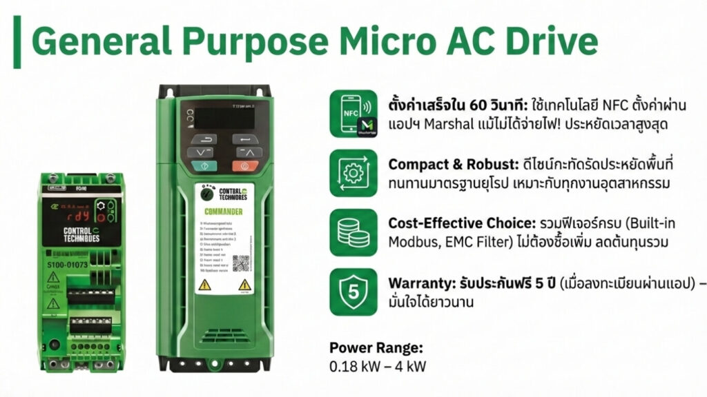 A: Nidec Drives มีระบบควบคุม Vector ขั้นสูง ความแม่นยำสูงกว่า และรองรับงาน Automation ระดับอุตสาหกรรม