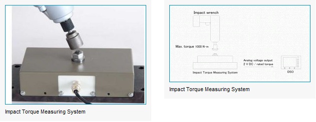 The system performs measurements by pressing the socket of an impact wrench or other tool directly to the nut-shaped attachment fitted to the sensor. Measurement results, including the torque waveform and maximum torque, can be read from a digital oscilloscope. The torque is detected by a torque converter developed by Sugawara. In addition to measuring impact torque, the Impact Torque Measuring System can be used to calibrate the static torque of various tools including torque wrenches.